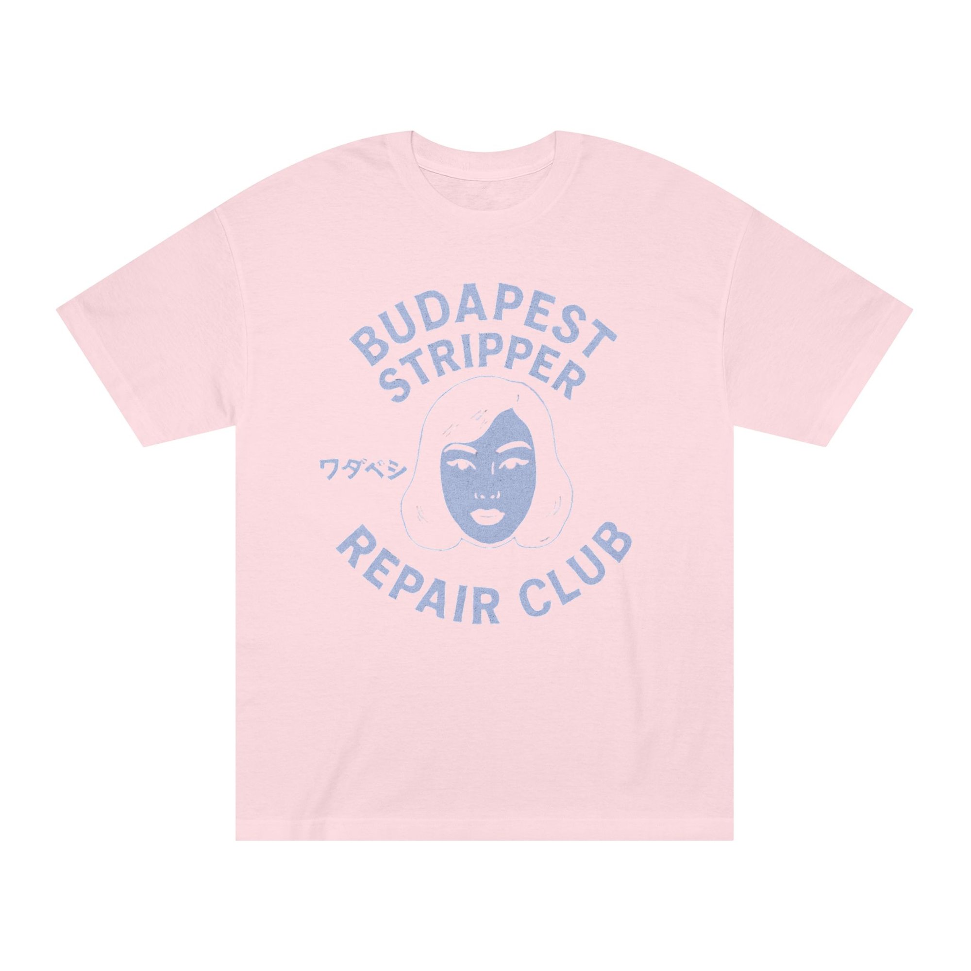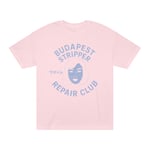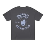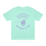 This classic tee brings a playful, slightly subversive attitude to relaxed streetwear. Soft medium-weight cotton and a roomy classic fit make it a shirt you'll reach for again and again — whether you're layering it under a jacket or wearing it solo on a warm day. The minty color and faded lavender graphic read like a vintage club emblem: a stylized face and the words “Budapest Stripper Repair Club,” with a small Japanese character for extra offbeat charm. It feels like an inside joke among friends, a nod to retro design and DIY zine culture. Wear it to shows, late-night hangs, or when you want your outfit to spark a smile and a conversation.