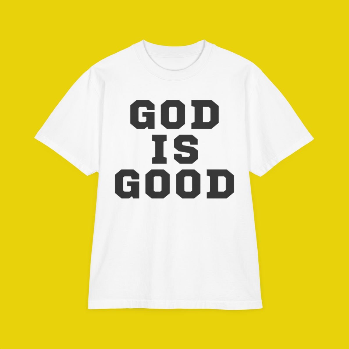 This garment-dyed drop-shoulder tee carries a quiet, confident message—bold block letters declare “GOD IS GOOD” on a soft, vintage-washed white canvas. The slightly oversized silhouette and forward-shoulder seam create a relaxed, lived-in fit that layers easily over hoodies or pairs with denim. Wear it to church gatherings, volunteer events, or casual days when you want your faith to speak simply and steadily. The worn-in color and smooth, strong cotton invite repeated wear and washing without losing shape, while the tear-away label keeps the neckline comfortable. It feels like a familiar reminder you reach for when you want to be seen and grounded at the same time.